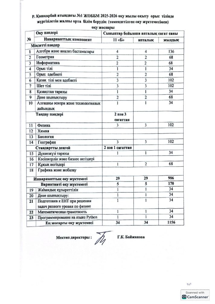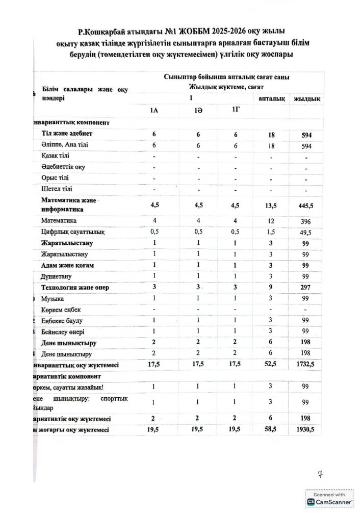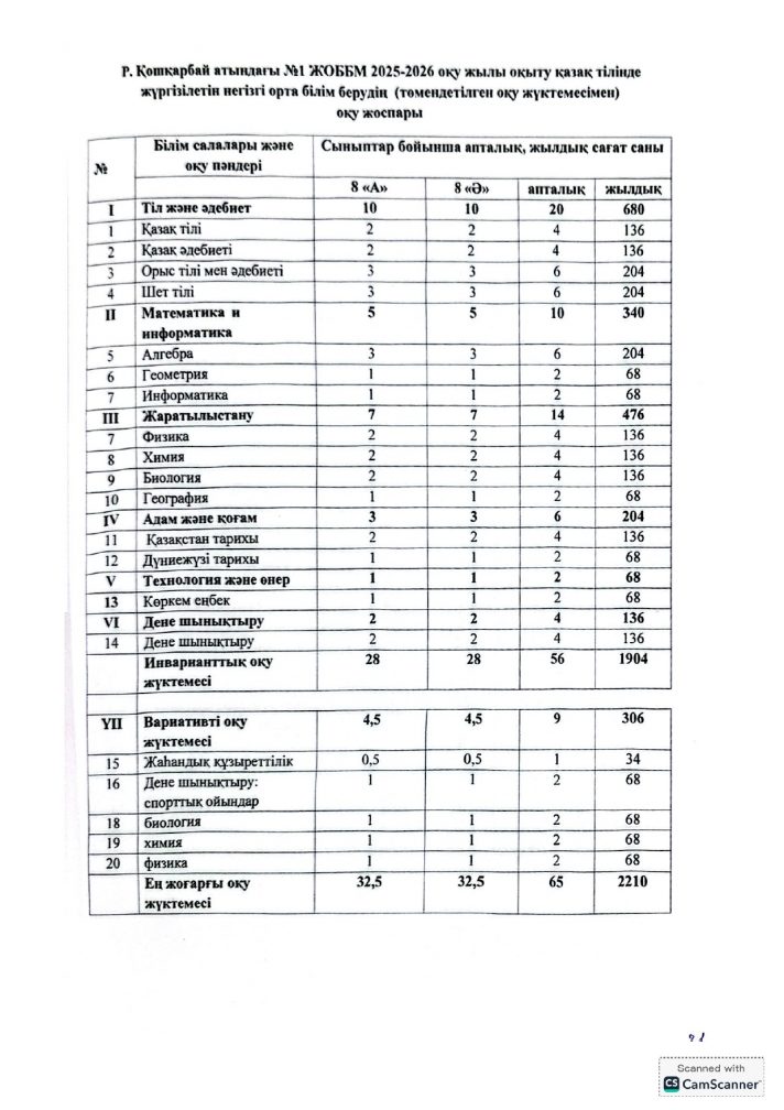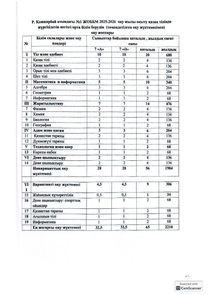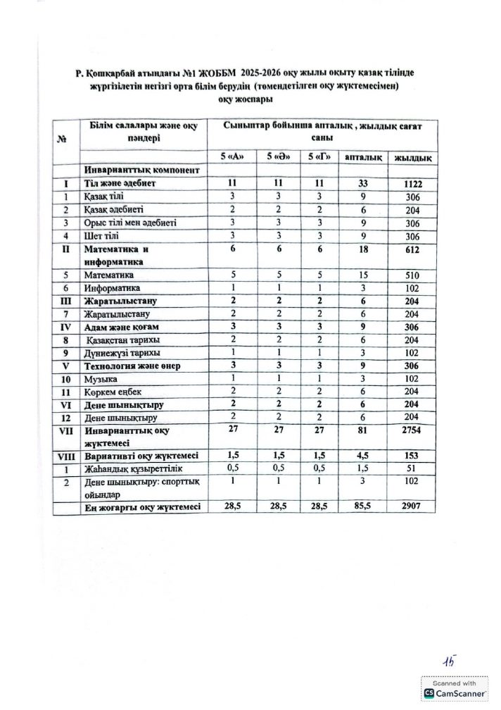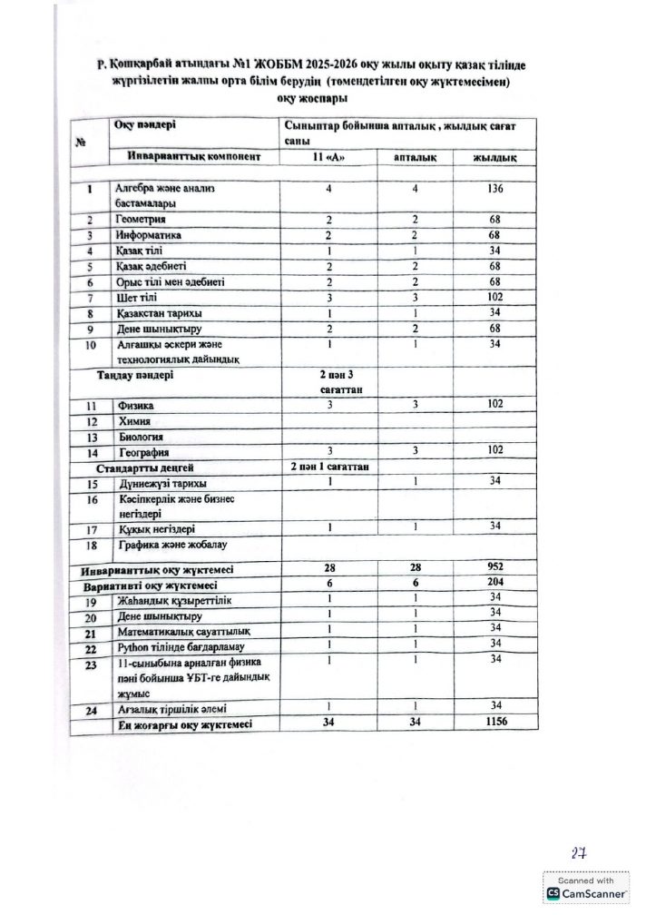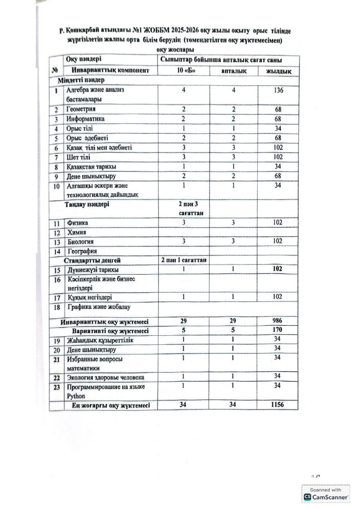 Мектептің 2025-2026 оқу жылына арналған оқу жоспары